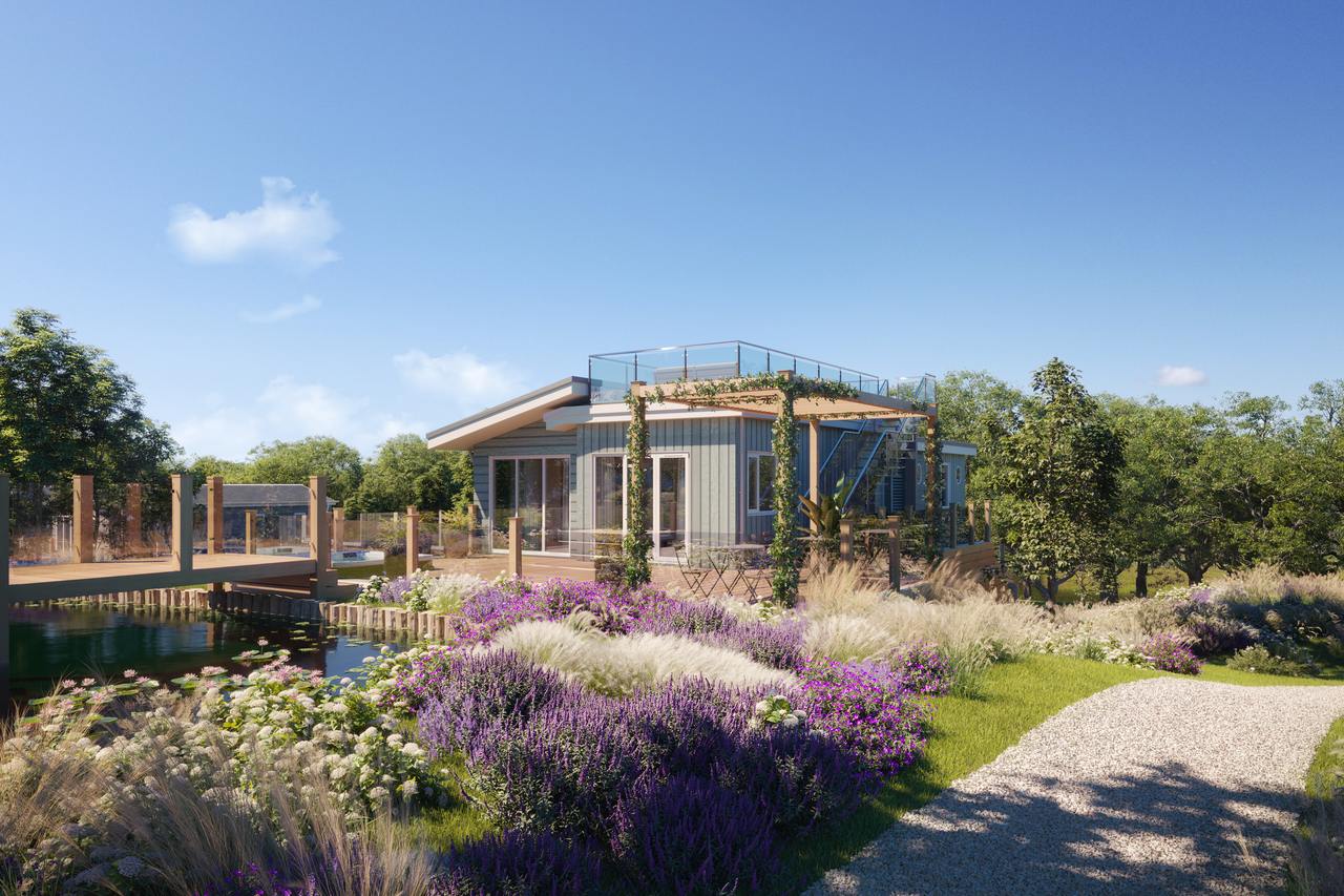 Nově vysazené živé ploty a keře jsou plné a chaty obklopují říční rybník s fontánou.