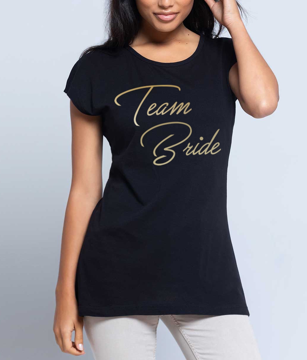Specifikace trička Barva trička: černá Barva potisku: polomatná zlatá folie Typ potisku: Team Bride Tričko v této specifikaci je připraveno k okamžitému odeslání. Při objednání do 11:00 a platbě na dobírku je tričko doručeno do druhého dne. Trička střední gramáže 140 g/m 2 jsou složena ze 100%25 bavlny, materiálu Single Jersey se silikonovou úpravou. Trička mají lehce volnější – oversize střih a velmi příjemně se nosí. Péče o textil s potiskem Toto tričko je potištěno polomatnou zlatou fólií. K zachování stálosti tisku je nutné dodržovat následující pravidla: Prát naruby bez aviváže, maximálně 30 stupňů Celsia, textil nesušte v sušičce. Velikostní tabulka dámského trička Velikost triček naleznete v této tabulce. Číselné hodnoty jsou uvedené v centimetrech a výrobce garantuje tyto velikosti s 5%25 odchylkou.