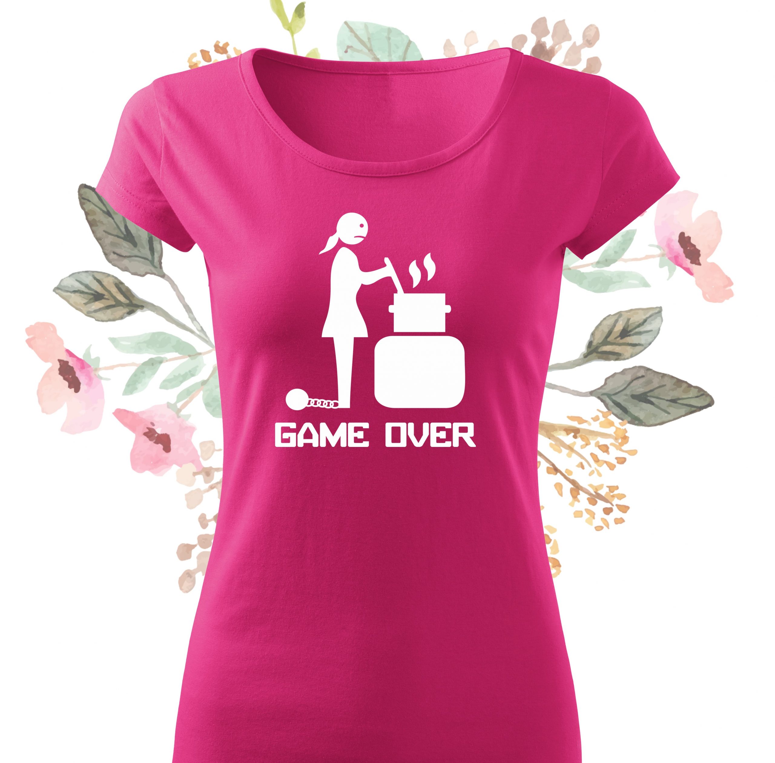 Dámské tričko purpurová – Game over Tmavě růžové tričko s bílým potiskem M – trička na rozlučku se svobodou