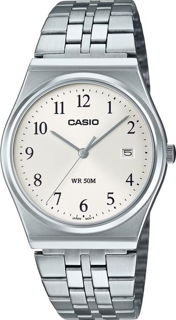 Velmi jednoduchý bílý číselník hodinek Casio MTP-B145D-7BVEF chrání minerální sklíčko. Ocelové pouzdro hodinek je doplněno ocelovým náramkem. Hodinky jsou vybaveny ukazatelem data na pozici 3. hodiny. Díky průměru pouzdra 35 mm jsou vhodné spíše pro dámy, ale tak pro pány s menším obvodem zápěstí. Voděodolnost tohoto modelu je 50m (5 ATM), zvládnou tedy základní kontakt s vodou, jako déšť, či sprcha.