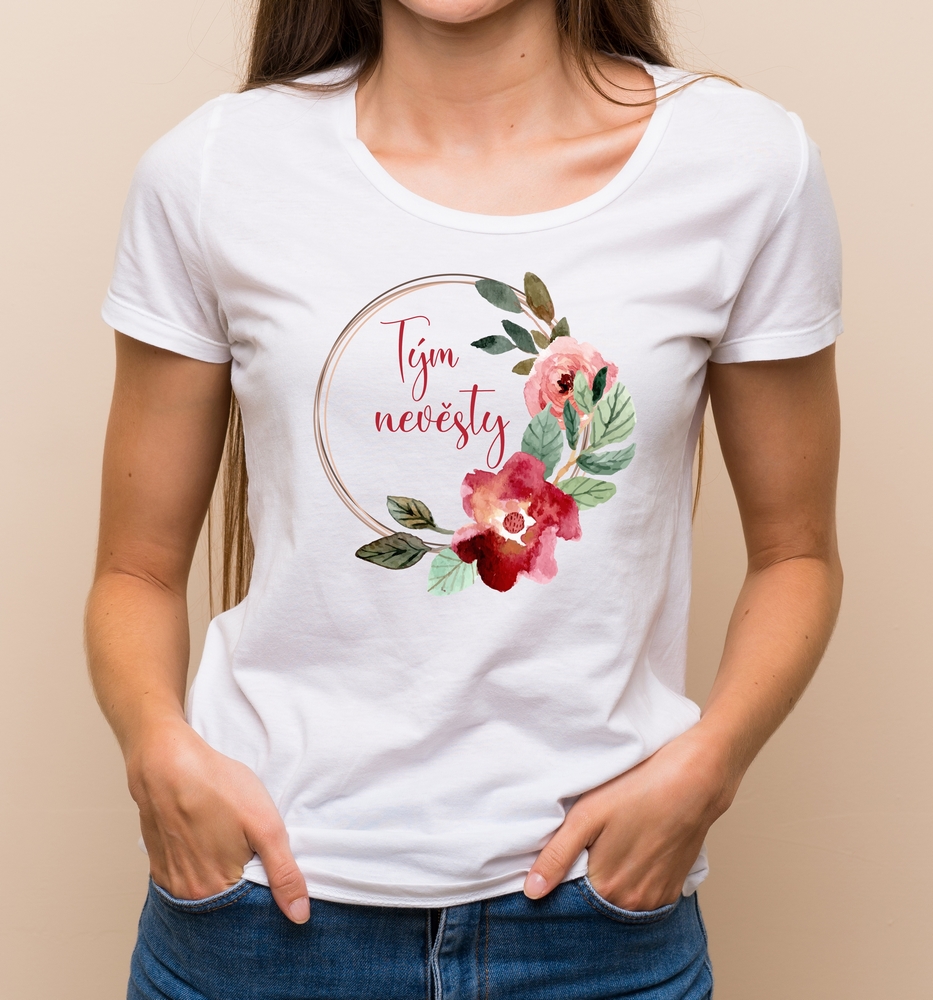 Specifikace trička Barva trička: bílá  Barva potisku: plnobarevný tisk s motivem akvarelového květinového věnečku Typ potisku: Tým nevěsty Tričko v této specifikaci je připraveno k okamžitému odeslání. Při objednání do 11:00 a platbě na dobírku je tričko doručeno do druhého dne. Trička střední gramáže 150 g/m 2 jsou složena ze 100%25 bavlny, materiálu Single Jersey se silikonovou úpravou a jsou tak velice pohodlné na nošení. Mají lehce vypasovaný střih s bočními švy.  Péče o textil s potiskem Toto tričko je tisknuté metodou digitálního tisku, která zaručuje stálost tisku i při dlouhodobém používání. K zachování stálosti tisku je však nutné dodržovat následující pravidla: Prát naruby bez aviváže, maximálně 30 stupňů Celsia, textil nesušte v sušičce. Velikostní tabulka dámského trička Velikost triček naleznete v této tabulce. Číselné hodnoty jsou uvedené v centimetrech a výrobce garantuje tyto velikosti s 5%25 odchylkou.