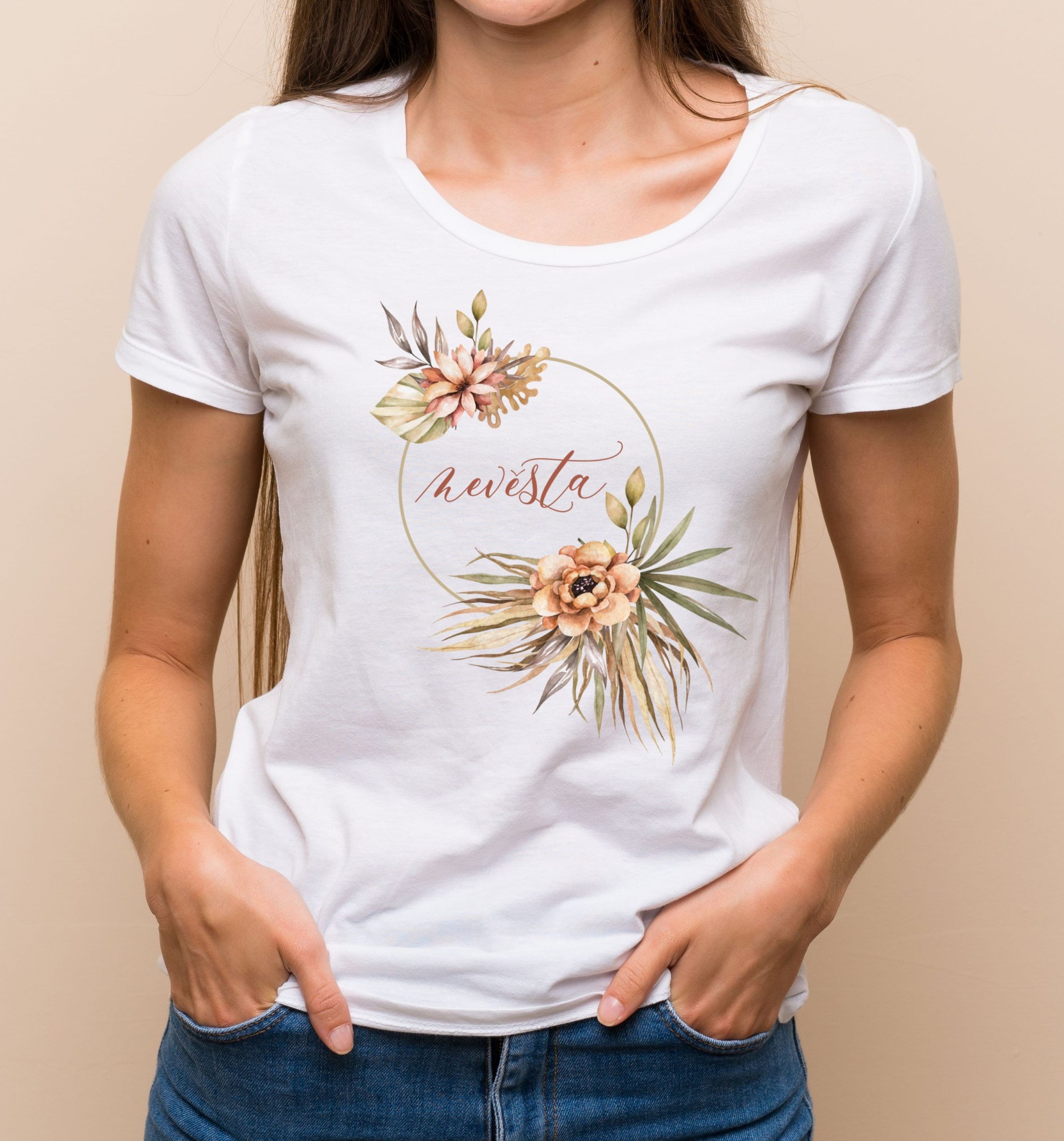 Specifikace trička Barva trička: bílá Barva potisku: plnobarevný tisk s motivem béžového věnečku Typ potisku: Nevěsta Tričko v této specifikaci je připraveno k okamžitému odeslání. Při objednání do 11:00 a platbě na dobírku je tričko doručeno do druhého dne. Trička střední gramáže 150 g/m 2 jsou složena ze 100%25 bavlny, materiálu Single Jersey se silikonovou úpravou a jsou tak velice pohodlné na nošení. Mají lehce vypasovaný střih s bočními švy. Péče o textil s potiskem Toto tričko je tisknuté metodou digitálního tisku, která zaručuje stálost tisku i při dlouhodobém používání. K zachování stálosti tisku je však nutné dodržovat následující pravidla: Prát naruby bez aviváže, maximálně 30 stupňů Celsia, textil nesušte v sušičce. Velikostní tabulka dámského trička Velikost triček naleznete v této tabulce. Číselné hodnoty jsou uvedené v centimetrech a výrobce garantuje tyto velikosti s 5%25 odchylkou.