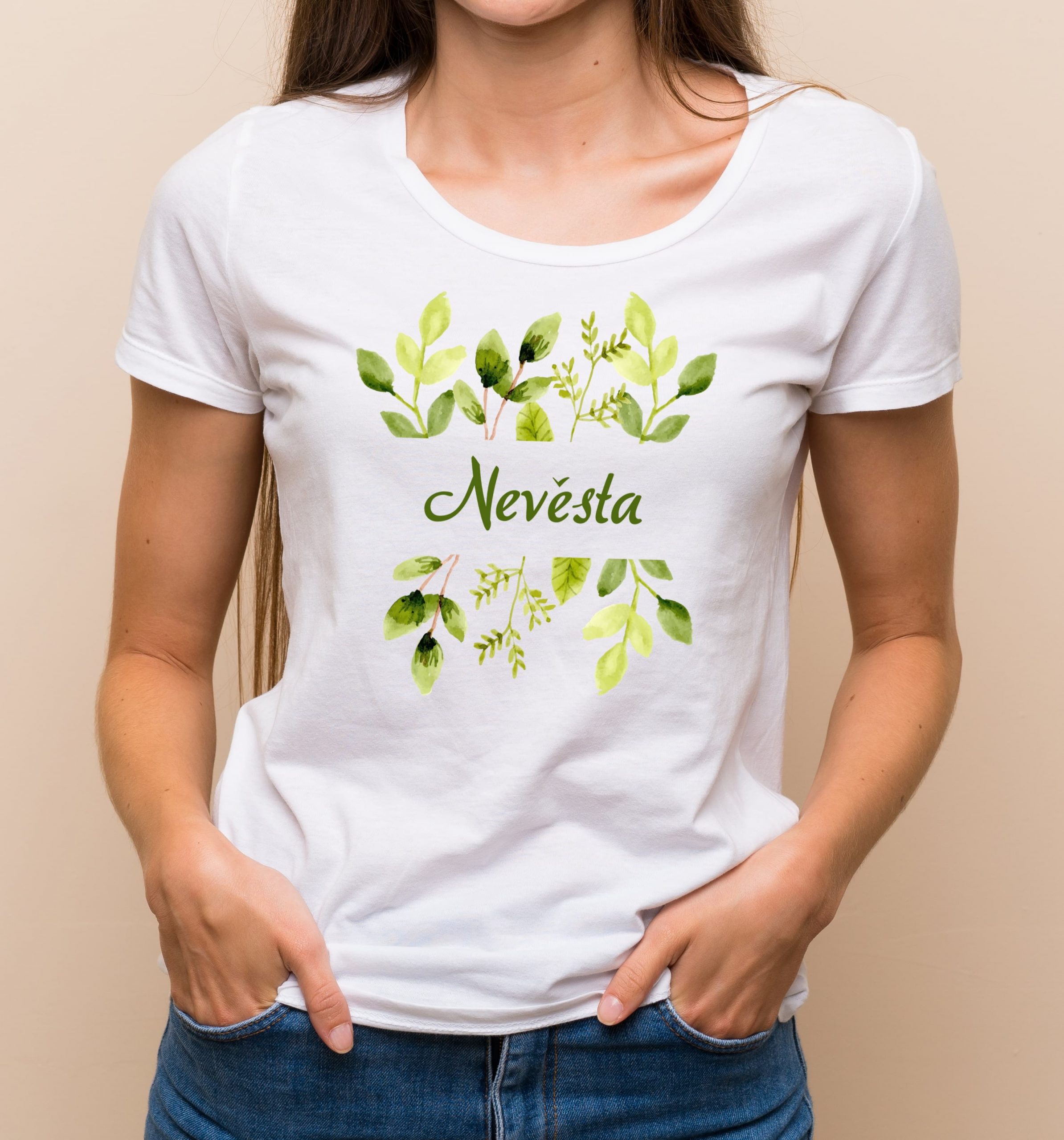 Specifikace trička Barva trička: bílá  Barva potisku: plnobarevný tisk s motivem  akvarelových zelených lístků Typ potisku: Nevěsta Tričko v této specifikaci je připraveno k okamžitému odeslání. Při objednání do 11:00 a platbě na dobírku je tričko doručeno do druhého dne. Trička střední gramáže 150 g/m 2 jsou složena ze 100%25 bavlny, materiálu Single Jersey se silikonovou úpravou a jsou tak velice pohodlné na nošení. Mají lehce vypasovaný střih s bočními švy.  Péče o textil s potiskem Toto tričko je tisknuté metodou digitálního tisku, která zaručuje stálost tisku i při dlouhodobém používání. K zachování stálosti tisku je však nutné dodržovat následující pravidla: Prát naruby bez aviváže, maximálně 30 stupňů Celsia, textil nesušte v sušičce. Velikostní tabulka dámského trička Velikost triček naleznete v této tabulce. Číselné hodnoty jsou uvedené v centimetrech a výrobce garantuje tyto velikosti s 5%25 odchylkou.