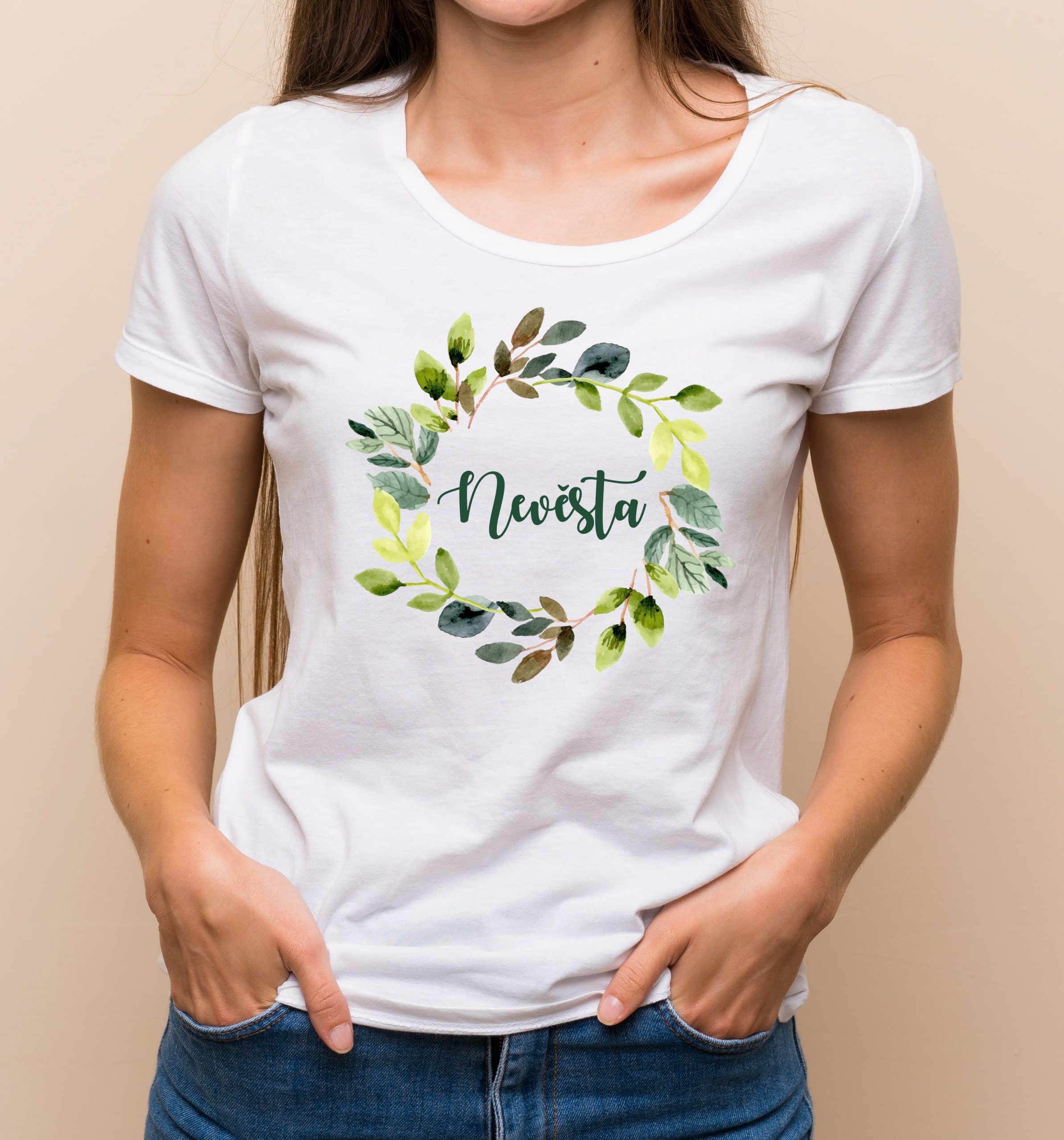 Květinové tričko zelený věneček – Nevěsta Bílé tričko s plnobarevným potiskem L – trička na rozlučku se svobodou